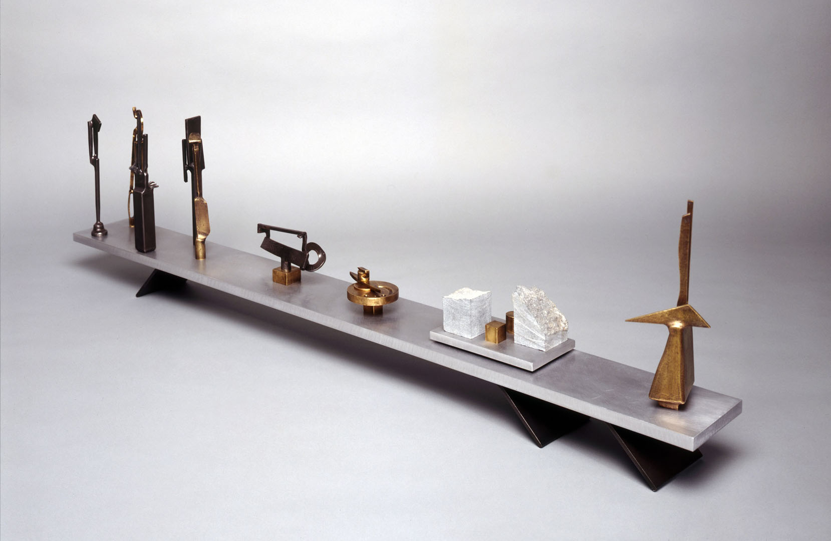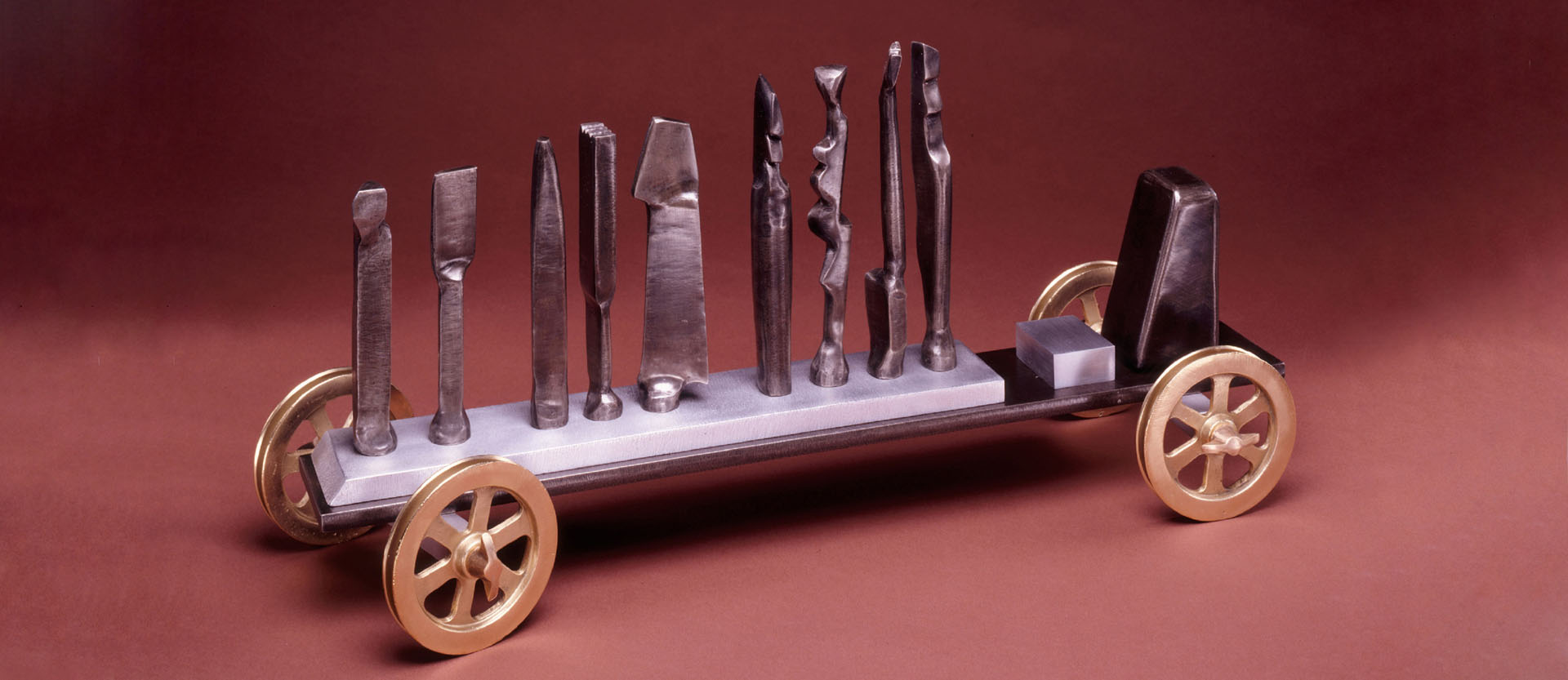 Asked about his work during this period, he said that “mythology is the dominant influence in my sculpture, specifically my focus is on the variety in repetition and continuation of stories, symbols, and numbers.” In letters to a friend in 1994 and 1996, he describes ‘Little Ferry Boat IV (Northern Line)’ as “nine forms on a boat-like structure” arranged as “4-3-2, i.e., 432” The motif of spiritual passage of seven or nine forms was also depicted by forms on a cart with wheels and appears in sculptures such as ‘Hell on Wheels II.